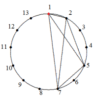 Мысленно расположим шкатулки по кругу, изобразив их точками, делящими окружность на 13 равных дуг длины 1, и будем выражать расстояния между шкатулками в дугах. Между любыми двумя шкатулками с одной из сторон круга находится не более 6 дуг длины 1. Тогда нам достаточно придумать шаблон – четырёхугольник с вершинами в шкатулках, – между вершинами которого реализуются все расстояния от 1 до 6. Пример такого шаблона изображён на рисунке (четырёхугольник с вершинами 1, 2, 5, 7), одна из его вершин помечена красным.