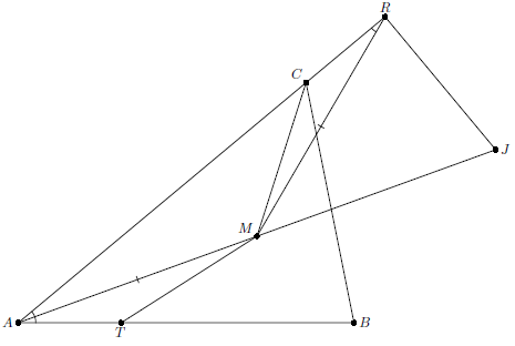 Пусть $R$ – проекция $J$ на прямую $AC$. Тогда $CR=p-AC=AT$. Также $MR=MA$ как медиана в прямоугольном треугольнике $AJR$ и $\angle MRA=\angle MAR=\angle MAT$. Следовательно, треугольники $MTA$ и $MCR$ равны по двум сторонам и углу между ними, а значит $MT=MC$.