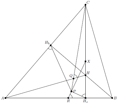 В остроугольном треугольнике $ABC$ проведены высоты $AH_A$, $BH_B$, $CH_C$. Пусть $X$ – произвольная точка отрезка $CH_C$, а $P$ – точка пересечения окружностей с диаметрами $H_CX$ и $BC$, отличная от $H_C$. Прямые $CP$ и $AH_A$ пересекаются в точке $Q$, а прямые $XP$ и $AB$ – в точке $R$. Докажите, что точки $A$, $P$, $Q$, $R$, $H_B$ лежат на одной окружности.