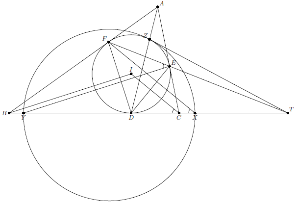 Пусть $I$ – центр $\omega$. Заметим, что $\angle FYX=\angle ICB=\angle FEX$, т.е. четырехугольник $XYEF$ – вписанный. Кроме того, прямые $BC$, $EF$ и касательная к $\omega$ в точке $Z$ пересекаются в одной точке $T$ – полюсе прямой $AD$ относительно $\omega$. Поэтому $TZ^2=TF\cdot TE=TX\cdot TY$, т.е. $TZ$ – касательная к окружности $XYZ$.
