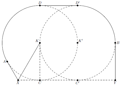 Пусть $\omega$, $\omega'$ – окружности с центрами $K$, $K'$ соответственно и радиусами, равными $KK'$, $CC'$ и $DD'$ – общие касательные к этим окружностям, $X$ – точка на прямой $CC'$ такая, что $\angle XKC=30^{\circ}$, $XA$ – касательная к $\omega$, $B$ – середина дуги $C'D'$, лежащей вне $\omega$, $Y$ – проекция $B$ на $CC'$. Тогда путь $KXADD'BY$ удовлетворяет условию, а его длина равна $10 (\sqrt{3}+2\pi/3+1+\pi/2+1) < 74$ км.
