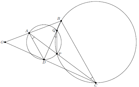 Окружности $\omega_1$ и $\omega_2$ пересекаются в точках $P$ и $Q$. Пусть $O$ – точка пересечения общих внешних касательных к $\omega_1$ и $\omega_2$. Прямая, проходящая через точку $O$, пересекает $\omega_1$ и $\omega_2$ в точках $A$ и $B$ соответственно, так, что эти две точки лежат по одну сторону от $PQ$. Прямая $PA$ повторно пересекает $\omega_2$ в точке $C$, а прямая $QB$ повторно пересекает $\omega_1$ в точке $D$. Докажите, что $O$, $C$ и $D$ лежат на одной прямой.