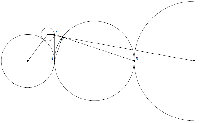 Центр внутренней гомотетии $\omega$ и $\Gamma_3$ лежит на отрезке $PB$. Пусть $H$ – проекция $A$ на этот отрезок. Тогда $PH:BH=PA^2:AB^2=r:r_3$. Следовательно, $H$ является искомой точкой пересечения внутренних касательных. Очевидно, что $H$ лежит на $\Gamma_2$ и любая точка этой окружности, отличная от $A$ и $B$, может быть получена таким образом.