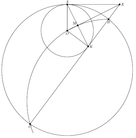 Рассмотрим две окружности $\Omega$ и $\omega$, касающиеся друг друга внутренним образом в точке $A$. Пусть хорда $BC$ окружности $\Omega$ касается окружности $\omega$ в точке $K$. Пусть также $O$ – центр $\omega$. Тогда окружность $BOC$ делит отрезок $AK$ пополам.