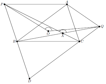 Дан остроугольный треугольник $ABC$. Точка $P$ выбрана так, что $AP=AB$ и $PB \parallel AC$. Точка $Q$ выбрана так, что $AQ=AC$ и $CQ \parallel AB$. Отрезки $CP$ и $BQ$ пересекаются в точке $X$. Докажите, что центр описанной окружности треугольника $ABC$ лежит на окружности $(PXQ)$.