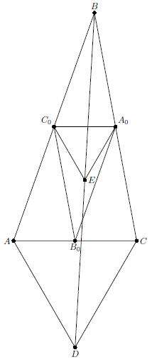Пусть $A_0$, $B_0$, $C_0$ – середины сторон $BC$, $CA$, $AB$ соответственно, $D$ – вершина правильного треугольника $ABD$, построенного во внешнюю сторону. Известно, что точка $T$ лежит на отрезке $BD$. При гомотетии с центром $B$ и коэффициентом $1/2$ прямая $B_0D$ переходит в серединный перпендикуляр к отрезку $A_0C_0$, следовательно, $E$ – середина $BD$ и $\angle C_0EA_0=60^{\circ}$. Соответственно, $\angle ABC=\angle A_0B_0C_0=30^{\circ}$.