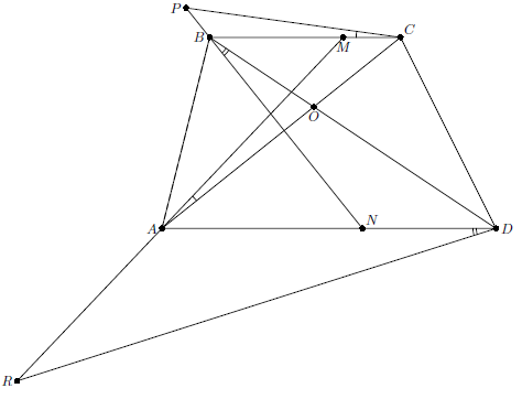 Заметим, что $\angle NBD=\angle ADR$ и $\angle MAC=\angle BCP$. Следовательно, точки $P$ и $R$ изогонально сопряжены в подобных треугольниках $BOC$ и $AOD$, откуда получаем искомое равенство.