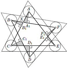 Опустим перпендикуляры из $AA_1$ на $BF$, $BB_1$ на $AC$ и т.д. Обозначим точку пересечения отрезков $AB_1$ и $A_1B$ через $X$. Несложно видеть, что длины отрезков $AA_1, BB_1$, ..., равны 2$r$. Заметим, что четырёхугольник $AA_1B_1B$ вписанный, поскольку ∠$AA_1B$ = ∠$AB_1B$, а так как $AA_1 = BB_1$, то он является равнобокой трапецией с основаниями $AB$ и $A_1B_1$. Следовательно, $\triangle AXA_1 = \triangle BXB_1$ и $AB_1 = A_1B$. Рассматривая трапеции $BB_1C_1C$, $CC_1D_1D$, ..., получаем аналогичные равенства треугольников и отрезков (см. рис.; на нём закрашены три пары равных треугольников из шести).