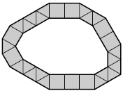 2) Пусть по крайней мере одна нечётная сторона $M$ равна нулю, а все чётные стороны отличны от нуля. Рассмотрим такое $i$, что $a_i$ = 0. Тогда угол при соответствующей вершине многоугольника $M$ будет равен 120° (поскольку $a_{i-1}$ и $a_{i+1}$ не равны 0), то есть его единственным образом можно разбить на два равносторонних треугольника. Далее каёмка восстанавливается однозначно. Действительно, достаточно возле всех сторон с нечётными номерами и ненулевой длиной разместить равносторонние треугольники, а возле сторон с чётными номерами и ненулевой длиной – квадраты. Получаем, что характеристика $M_1$ будет равна $(a_1, a_2 - 1, a_3, a_4 - 1, ..., a_{11}, a_{12} - 1)$.