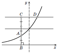 Отметим на графике произвольную точку $A$ и построим перпендикуляр $AB$ к оси $x$ (см. рис.). На продолжении отрезка $BA$ за точку $A$ отметим такую точку $C$, что $AC=2AB$. Далее построим прямую, проходящую через точку $C$ параллельно оси $x$, и обозначим через $D$ точку её пересечения с графиком. Тогда длина отрезка $CD$ равна 1. Действительно, если $A$ имеет координаты $(x_0,3^{x_0})$, то ордината точки $D$ равна $3\cdot 3^{x_0}=3^{x_0+1}$, поэтому её абсцисса равна $x_0+1$.