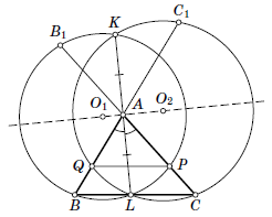 Решение 2:Отметим точки $B_1$ и $C_1$, симметричные точкам $B$ и $C$ относительно внешней биссектрисы угла $BAC$. Так как эта внешняя биссектриса перпендикулярна $KL$, она является серединным перпендикуляром к отрезку $KL$, т. е. совпадает с прямой $O_1O_2$, соединяющей центры окружностей. Поскольку $KL$ является общей хордой окружностей $(BLK)$ и $(CLK)$, при симметрии относительно $O_1O_2$ они переходят в себя, поэтому точки $B_1$ и $C_1$ лежат на $(BLK)$ и $(CLK)$ соответственно. Заметим, что $AB_1 \cdot AP = KA \cdot AL = AC_1 \cdot AQ$, поэтому $AB\cdot AP =AC\cdot AQ$, откуда $\frac{AB}{AQ} =\frac{AC}{AP}$. По обратной теореме о пропорциональных отрезках получаем $QP\parallel BC$. Это решение можно окончить иначе. Заметим, что из соотношения $AB_1 \cdot AP = AC_1 \cdot AQ$ следует, что четырехугольник $B_1QPC_1$ – вписанный, поэтому $\angle{AQP} = \angle{C_1B_1A} = \angle{ABC}$, откуда вытекает требуемое.