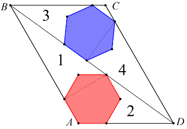 Параллелограмм разделён на два данных шестиугольника, четыре невыпуклых четырёхугольника (обозначены на рисунке цифрами 1, 2, 3, 4) и треугольник, примыкающий к вершине $C$. Заметим, что четырёхугольники 1 и 4 подобны – они получаются вырезанием из двух подобных прямоугольных треугольников равнобедренных треугольников с углом 120° при вершине. Аналогично подобны четырёхугольники 2 и 3. Коэффициенты подобия равны отношению сторон данных шестиугольников.Но площади половинок параллелограмма $ABD$ и $CBD$ равны, причём половинка $ABD$ состоит из первого шестиугольника и четырёхугольников 1 и 2, а вторая – из второго шестиугольника, четырёхугольников 3 и 4 и ещё белого треугольника. Значит, сторона шестиугольника, примыкающего к вершине $A$, больше.