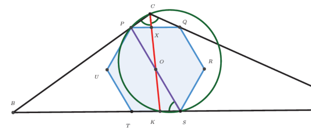 Решение 2: Диагональ красного шестиугольника совпадает с биссектрисой треугольника $ABD$, которая равна биссектрисе $CK$ треугольника $BCD$. Пусть синий шестиугольник – это $PQRSTU$, как на рисунке. Требуется сравнить диагонали $CK$ и $PS$ правильных шестиугольников. Они пересекаются в центре $O$ шестиугольника, так как четырёхугольник $PCQO$ вписанный, $CK$ биссектриса и поэтому делит дугу $POQ$ пополам, то есть проходит через $O$. Заметим, что прямая $CO$ пересекает отрезок $PQ$, поэтому (из симметрии относительно $O$) она пересекает и отрезок $TS$. Углы $PCK$ и $PSK$ равны по 60°. Далее есть несколько способов.