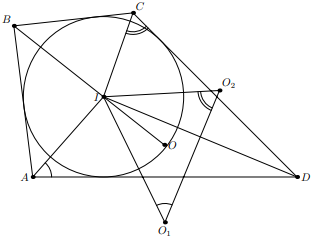 Четырехугольник $ABCD$ описан около окружности с центром $I$. Точки $O_1$ и $O_2$ – центры описанных окружностей треугольников $AID$ и $CID$. Докажите, что центр описанной окружности треугольника $O_1IO_2$ лежит на биссектрисе угла $B$ четырехугольника.