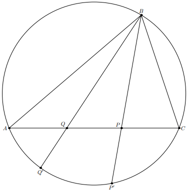 Вписанная и вневписанная окружности треугольника $ABC$ касаются отрезка $AC$ в точках $P$ и $Q$ соответственно. Прямые $BP$ и $BQ$ вторично пересекают описанную окружность треугольника $ABC$ в точках $P'$ и $Q'$ соответственно. Докажите, что $PP' > QQ'$.