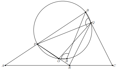Так как $\angle ARP=\angle BAC$, $\angle CRQ=\angle BCA$, то $\angle PRQ=\angle ABC$ и $\angle PHQ=180^{\circ}-\angle ABC$, т.е. точки $B$, $P$, $Q$, $H$ лежат на одной окружности. Кроме того, проекции точек $P$, $Q$ на $AC$ являются серединами отрезков $AR$, $CR$, поэтому расстояние между ними равно половине $AC$. Пусть $M$, $N$ – середины сторон $AB$, $BC$ соответственно. Так как проекции отрезков $PM$ и $QN$ на $AC$ равны, то $\frac{PM}{QN}=\frac{\cos\angle ACB}{\cos\angle BAC}=\frac{OM}{ON}$. Следовательно, треугольники $OPM$ и $OQN$ подобны, т.е. $\angle POQ=\angle MON=\angle PHQ$. Таким образом, точка $O$ также лежит на окружности $BPHQ$, поэтому $\angle BOH=\angle BQH=90^{\circ}+\angle BCA-\angle BAC$, что равносильно утверждению задачи.