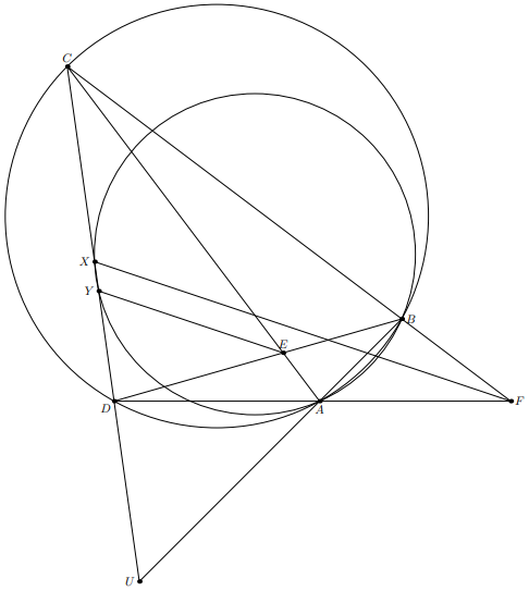 Пусть $U$ – точка пересечения $AB$ и $CD$ (см. рис.). Тогда $\frac{DY}{YC} = \frac{DE}{EC} = \frac{AD}{BC} = \frac{UD}{UB}$ (второе равенство следует из подобия треугольников $EAD$ и $EBC$, третье – из подобия $UDA$ и $UBC$). Следовательно, $$UY = UD + UD \cdot \frac{CD}{UD+UB} = UD \cdot \frac{UC+UB}{UD+UB}.$$ Аналогично получаем, что $UX = UC \cdot \frac{UD+UB}{UC+UB}$. Значит $UX \cdot UY = UC \cdot UD = UA \cdot UB$. При других расположениях точек рассуждение аналогично.