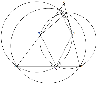 Пусть окружность $AQC$ вторично пересекает прямую $AP$ в точке $X$, а окружность $BQD$ вторично пересекает прямую $DP$ в точке $Y$. Тогда $\angle AXC=\angle CQD=\angle BQA=\angle BYD$. Следовательно, точки $B$, $C$, $X$, $Y$ (а значит, и $A$, $D$, $X$, $Y$) лежат на одной окружности, т.е. $PX:PY=PC:PB=PD:PA$ и $PQ$ – радикальная ось окружностей $AQC$ и $BQD$.