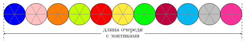 В очереди под дождём стояли 11 человек, каждый держал зонтик. Они стояли вплотную, то есть зонтики соседей соприкасались (см. рис).