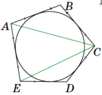 Решение 1. Прямые, соединяющие вершины с центром $O$ вписанной окружности $\omega$, являются биссектрисами углов пятиугольника. Поэтому $\angle OAE = \angle OEA = 50^{\circ}, \angle AOE = 80^{\circ}$. Пусть $\omega$ касается сторон $BC$ и $AE$ в точках $K$ и $M$ соответственно. Тогда $\angle OCK = 50^{\circ}$, и прямоугольные треугольники $OMA$, $OKC$ и $OME$ равны по катету и острому углу. Значит, $OA = OC = OE$, т. е. точки $A$, $C$ и $E$ лежат на окружности с центром $O$. Решение 2. Так как углы $A$, $C$, $E$ равны, все касательные к окружности из этих вершин равны. Поскольку касательные из вершины B тоже равны, треугольник $ABC$ равнобедренный, и треугольник $CDE$ тоже (аналогично). Сумма углов $B$ и $D$ равна $540^\circ – 3\cdot 100^\circ = 240^\circ$, поэтому $\angle ACB + \angle ECD = (2\cdot180^\circ – 240^\circ):2 = 60^\circ$, а $\angle ACE = 100^\circ – 60^\circ = 40^\circ$.