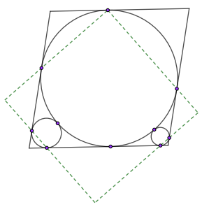Большая окружность вписана в ромб, каждая из двух меньших окружностей касается двух сторон ромба и большой окружности, как на рисунке. Через точки касания окружностей со сторонами ромба провели четыре штриховые прямые, как на рисунке. Докажите, что они образуют квадрат.
