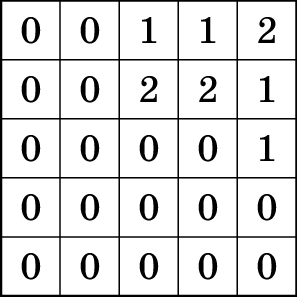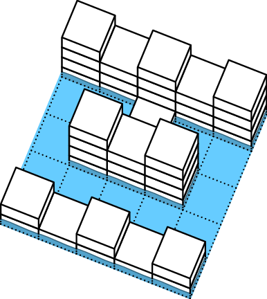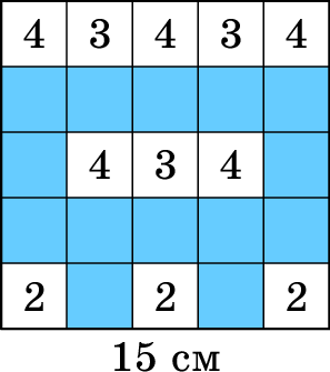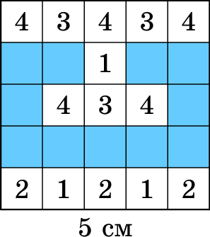 Посреди пустого бассейна стоит квадратная платформа 50 × 50 сантиметров, расчерченная на клеточки 10× 10 см. На клетки платформы Лена ставит башенки из кубиков 10× 10× 10 см. Потом Таня включает воду. Если высоты башенок были такие, как в таблице справа, то при уровне воды 5 см был 1 остров, при уровне воды 15 см было два острова (если острова «граничат по углу», то считаются отдельными островами), а при уровне воды 25 см все башенки оказались закрыты водой и стало 0 островов.
