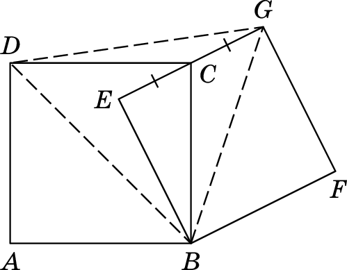Решение 3:Рассмотрим треугольникиDEGиDEB. У них общая сторонаDE, равные стороныEGиEB(как две стороны квадрата). Осталось доказать, что углыDEGиDEBравны, — тогда указанные треугольники будут равны (по двум сторонам и углу между ними), а значит, будут равны и соответственные стороныDGиDB. Равенство этих углов можно доказать так. Отметим H — середину отрезка EB. Заметим, что HB = EC как половины стороны правого квадрата, а также BC = DC, ∠HBC = 90° - ∠ECB = ∠ECD. Значит, треугольники HBC и ECD равны по двум сторонам и углу между ними. Так как треугольник EHC равнобедренный прямоугольный, ∠EHC = 45°, а ∠DEG = ∠CHB = 180° - ∠EHC = 135°. Но тогда и ∠DEB = 360° - ∠DEG - ∠GEB = 360° - 135° - 90° = 135°.