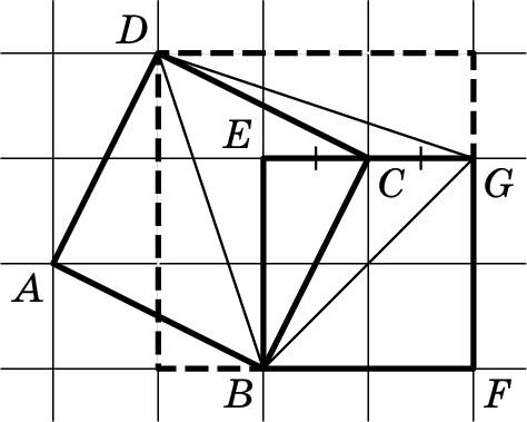 Решение 1:Перенесём чертёж на клетчатую бумагу. Начнём с квадратаBEGF: пусть это клетчатый квадрат 2×2. По отрезкуBCпостроим квадратABCD. Теперь видно, что отрезкиDGиDBравны как гипотенузы прямоугольных треугольников с катетами длиной 1 клетка и 3 клетки.