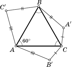 Чтобы из предложенных отрезков можно было сложить треугольник, достаточно доказать, что наибольший из отрезков $AB'$, $BC'$, $CA'$ меньше суммы двух других. Мы можем считать, что наибольший из этих отрезков — это $AB'$. Тогда повернём треугольник $AB'C$ на $60^\circ$ против часовой стрелки относительно точки $A$. Точка $C$ при этом перейдёт в точку $B$ из-за того, что треугольник $ABC$ — правильный, а точка $B'$ — в новую точку $B''$. Теперь рассмотрим треугольник $AC'B''$: в нём боковые стороны $AC'$ и $AB''$ равны, а угол между ними больше $60^\circ$, поскольку угол $C'AB'$ по условию больше $120^\circ$. Следовательно, углы при основании $C'B''$ будут меньше $60^\circ$. Поскольку в треугольнике против большего угла лежит большая сторона, то $C'B'' > AB'' = AB'$. Рассмотрим треугольник $B''C'B$. В нём по неравенству треугольника $C'B'' < BC'+B''B = BC' + CB'=BC'+ CA'$. Тогда из двух полученных неравенств следует, что $AB' < C'B'' < BC'+ CA'$. Значит, из отрезков $AB'$, $BC'$, $CA'$ можно составить треугольник.