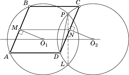 Решение 1:Предположим противное: радиусы окружностей $\omega_{1}$ и $\omega_{2}$, описанных около треугольников $PAB$ и $PCD$ соответственно, различны. При параллельном переносе на $\smash{\overrightarrow{CB}}$ отрезок $CD$ перейдёт в отрезок $AB$, окружность $\omega_{2}$ перейдёт в окружность $\omega_{3}$, а прямая $O_1O_2$ перейдёт в себя. Причём $\omega_{3}$ не может совпадать с $\omega_{1}$, поскольку их радиусы различны. Поэтому линия центров $O_3O_1$, совпадающая с прямой $O_1O_2$, перпендикулярна общей хорде $AB$. Таким образом, прямая $AB$ параллельна общей хорде окружностей $\omega_{1}$ и $\omega_{2}$ и, следовательно, перпендикулярна прямой $AD$. Тогда параллелограмм $ABCD$ является прямоугольником, что противоречит условию задачи. Следовательно, радиусы окружностей $\omega_{1}$ и $\omega_{2}$ равны.