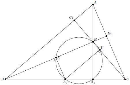 Расстояние от центра описанной окружности до стороны $BC$ равно половине отрезка $AH$, где $H$ – ортоцентр. С другой стороны, из условия задачи следует, что это расстояние равно половине отрезка $HA_1$. Следовательно, $H$ – середина $AA_1$. Пусть $A_0$ – середина $BC$. Так как середины $X$, $Y$ высот $BB_1$, $CC_1$ лежат на средних линиях треугольника, углы $A_0XH$ и $A_0YH$ прямые, т.е. точки $X$ и $Y$ лежат на окружности с диаметром $A_0H$. Очевидно, что $A_1$ тоже лежит на этой окружности.