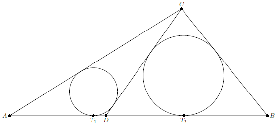 Заметим, что при движении точек $T_1$, $T_2$ по $AB$ центры окружностей движутся по биссектрисам углов $A$ и $B$ соответственно, а отношение их радиусов остается равным $\operatorname{ctg}\frac{A}2:\operatorname{ctg}\frac{B}2=AD:BD$. Следовательно, центр гомотетии движется по прямой, проходящей через $D$. При этом, поскольку $AC+AD=BC+BD$, вписанной окружности треугольника $ACD$ при этом движении соответствует вписанная окружность треугольника $BCD$.