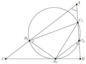 Решение 2:Пусть отрезки $B_1C_2$ и $A_1C_1$ пересекаются в точке $O$. Покажем, что это диагонали вписанного четырехугольника. Несложно найти, в каких отношениях они друг друга делят: $C_1O=A_1O=x$, $B_1O=3y,$ $C_2O=y$. Также понятно, что $A_1C_1=\frac23 AM $, $B_1C_2=\frac23 BC$, откуда $A_1C_1:B_1C_2=AM:BC=\frac{\sqrt{3}}{2}$. Получаем $\frac{2x}{4y}=\frac{\sqrt{3}}{2}$, значит $x^2=3y^2$, поэтому $B_1O\cdot C_2O=C_1O\cdot A_1O$. То есть $B_1C_1C_2A_1$ вписанный по утверждению о степени точки.