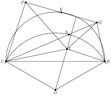 Применяя лемму к треугольникам $BIQ'$, $CIP'$ и $BOC$, получаем, что $OI\perp P'Q'$. Поэтому точки $P'$, $Q'$ совпадают с $P$, $Q$ и $\angle PIQ=90^{\circ}$.