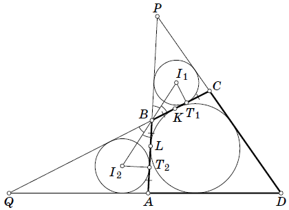 Пусть $T_1$ и $T_2$ – точки касания вписанных окружностей треугольников $PBC$ и $QAB$ со сторонами $BC$ и $AB$ соответственно, а $K$ и $L$ – точки касания вписанной в $ABCD$ окружности со сторонами $BC$ и $AB$ соответственно (см. рис.).