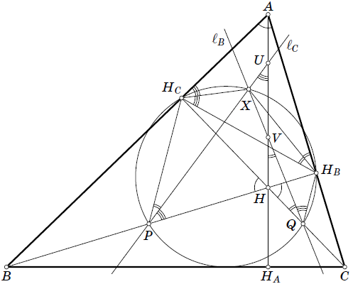 Пусть прямые $\ell_C$ и $\ell_B$ пересекают отрезки $BH$, $CH$ в точках $P$ и $Q$ соответственно, а точку пересечения $\ell_B$ и $\ell_C$ обозначим через $X$. Пусть углы $ A$, $ B$ и $ C$ треугольника $ABC$ равны $2\alpha$, $2\beta$ и $2\gamma$ соответственно. Поскольку $HP = HH_C$ и $HQ = HH_B$, то треугольники $HH_CP$ и $HH_BQ$ – равнобедренные с углами, равными $\angle H_CHB = \angle BAC = 2\alpha$, напротив оснований. Поэтому $$ \angle HPH_C = \angle HQH_B = 90^\circ-\alpha =\beta +\gamma. $$ Пусть прямые $\ell_C$ и $\ell_B$ пересекают отрезок $AH$ в точках $U$ и $V$ соответственно. Тогда треугольник $PUH$ – равнобедренный с основанием $PU$, значит, $$ \angle XPH = \angle UPH = \frac{180^\circ - \angle BHA}{2} = \gamma. $$ Рассуждая аналогично для треугольника $QVH$, получаем, что $\angle XQH = \beta$. Тогда $$ \angle XPH_C = \angle HPH_C - \angle HPX = \beta+\gamma- \gamma = \beta = \angle XQH_C, $$ откуда следует, что $X$ лежит на окружности, описанной около треугольника $H_CPQ$. Аналогично точка $X$ лежит на окружности, описанной около треугольника $H_BPQ$. Таким образом, пять точек $X$, $H_B$, $P$, $Q$, $H_C$ лежат на одной окружности.