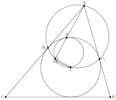 Точки $A$, $B_1$, $C_1$ лежат на окружности с диаметром $AI$, где $I$ – центр вписанной окружности. Поэтому $\angle IA_2A=\angle IA_2P=90^{\circ}$ и точка $A_2$ лежит на окружности с диаметром $IP$, которая касается $\omega$ в точке $P$. Точки $B_2$, $C_2$ также лежат на этой окружности.