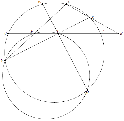 Лемма. Пусть фиксированы окружность $S$ с точкой $A$ на ней, точка $P$ и прямая $t$ через $P$. Произвольная, проходящая через $P$ прямая $q$ пересекает $S$ в двух точках $X$, $Y$. Прямые $AX$, $AY$ пересекают $t$ в точках $E$, $F$. Тогда точка Микеля четырёхугольника $FEXY$ фиксирована. Доказательство. Пусть $W$ – такая точка на $S$, что $AW\parallel t$; $PW$ вторично пересекает $S$ в точке $M$; $U$, $V$ – точки пересечения $t$ и $S$. Тогда $\angle PMY=\smile WY/2=(\smile UY+\smile AV)/2=\angle UFY$, т.е. $M$ лежит на окружности $PFY$. Аналогично $M$ лежит на окружности $PEX$.