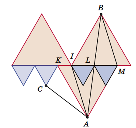 Решение 1:Добавим на рисунок ещё два маленьких треугольника, как показано на рисунке. Заметим, что $AIBM$ – параллелограмм, а $L$ – его центр. При повороте на 60° против часовой стрелки вокруг точки $A$ треугольник $AML$, очевидно, переходит в треугольник $AKC$. Таким образом, в треугольнике $ABC$ имеем: