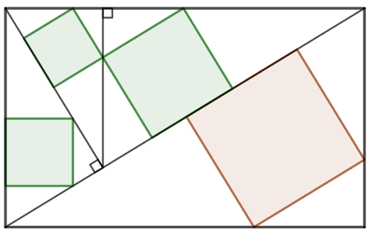Произвольный прямоугольник разбит на прямоугольные треугольники так, как показано на рисунке ниже. В каждый треугольник вписан квадрат со стороной, лежащей на гипотенузе. Что больше: площадь самого большого квадрата или сумма площадей трёх остальных квадратов?