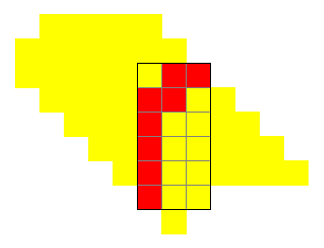 $y - x = a - b$, поэтому числа $x$ и $y$ имеют разную чётность. Оставим $k = x+y$ полосок. Может оказаться, что после этого левая верхняя часть прямоугольника уже не будет находиться внутри фигуры. Исправляем это так: увеличиваем $x$ на 1, то есть смещаем прямоугольник на вектор (–1, 1), при этом $y$ тоже увеличивается на 1, то есть число полосок увеличивается на 2. Если этого не хватило, повторяем процедуру (после каждого шага прямоугольник смещается на одну горизонталь и одну вертикаль, а число полосок увеличивается на 2, поэтому в какой-то момент прямоугольник окажется полностью внутри фигуры).