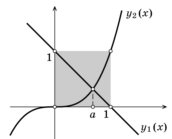 Он существует и принадлежит интервалу $(0, 1)$, потому что графики функций $y_1(x) = 1-x$ и $y_2(x) = x^3$ пересекаются внутри единичного квадрата на координатной плоскости (см. рисунок).