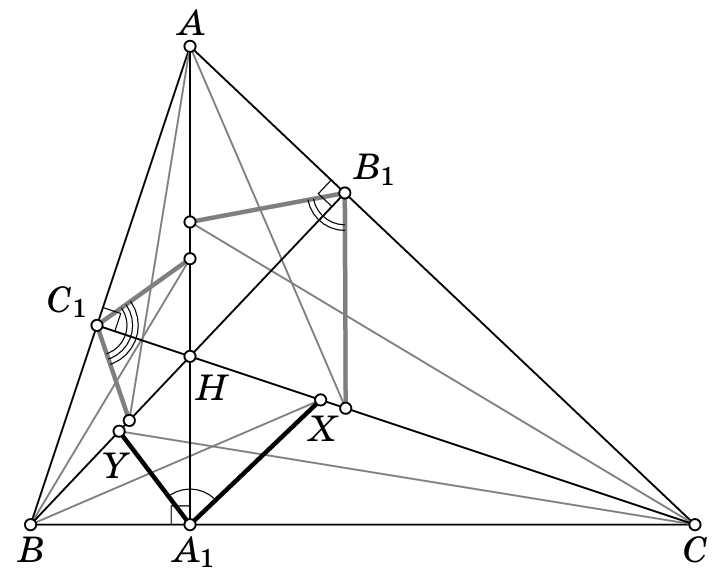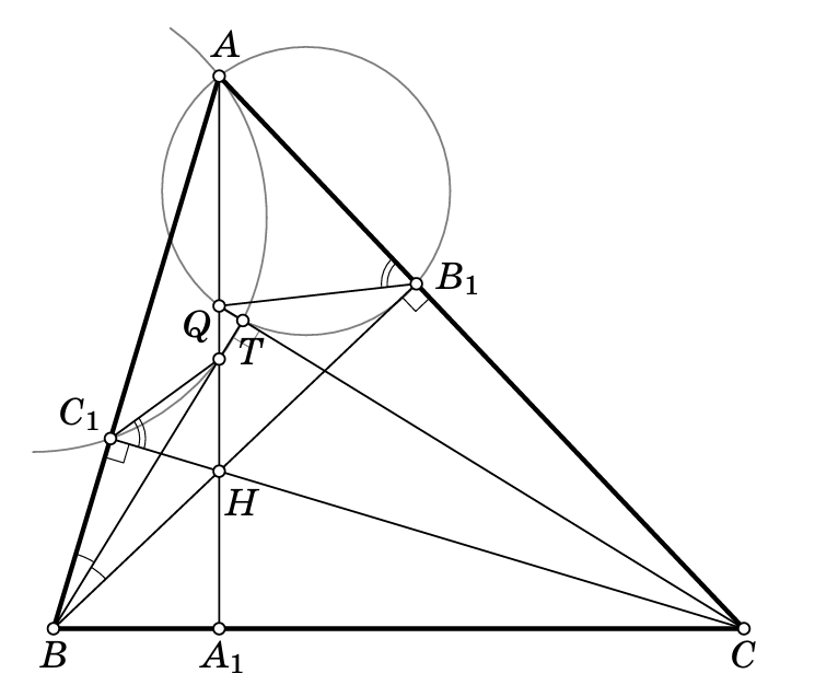 Замечание для знатоков.Это решение можно переформулировать в терминах инверсии. Рассмотрим композицию инверсии с центром в точке $A_1$ радиуса $\sqrt{BA_1 \cdot A_1C}$ и симметрии относительно прямой $AA_1$. При этой композиции меняются местами точки $B$ и $C$, $A$ и $H$. Окружность, построенная на $BC$ как на диаметре, переходит в себя, поэтому точки $B_1$ и $C_1$ меняются местами. Если точка $P$ переходит в $P'$, то по свойству инверсии $\angle PBH = \angle P'CA$, то есть $P' = Q$. Но тогда $\angle PC_1H = \angle QB_1A$, что и требовалось.