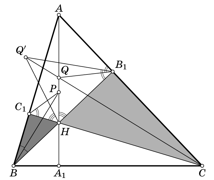 $$\angle ACQ' = \angle ACQ = \angle C_1BP \quad \text{и} \quad \angle Q'HC_1 = \angle QHB_1 = \angle PHB_1,