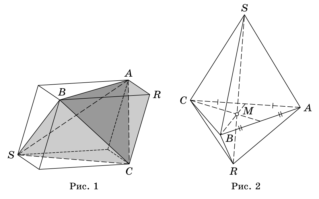 Решение 1:Пусть рёбра $S A, S B, S C$ параллельны граням $B C R, A C R$ и $A B R$ соответственно. Проведём через $S A$, $S B$, $S C$ плоскости, которые параллельны $B C R$, $A C R$ и $A B R$ соответственно. Получается параллелепипед, пять вершин которого совпадают с вершинами наших пирамид (рис. 1). Пусть $V$ – объём этого параллелепипеда. Тогда объём пирамиды $R A B C$ равен $V / 6$, как и объём трёх других пирамид, основаниями которых являются грани тетраэдра $S A B C$. Поэтому объём пирамиды $S A B C$ равен $V-4 \cdot V / 6=2 \cdot V / 6$, то есть вдвое больше объёма пирамиды $R A B C$, что и требовалось доказать.