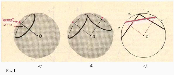 Каждой окружности на сфере можно сопоставить ее "центр на сфере"– конец радиуса сферы, проходящего через центр окружности (никогда не лежащий на сфере). Эту точку мы будем называть "центром" окружности в кавычках, подчеркивающих, что это не "обычный" центр (рис. 1 а ). Заметим для точности, что такого определенного "центра" нет у окружностей больших кругов сферы, у которых центр совпадает с центром сферы. Но окружности, о которых идет речь в условии задачи, заведомо не могут иметь радиус1, потому что окружности двух больших кругов не могут друг друга касаться, они всегда пересекают друг друга в двух диаметрально противоположных точках сферы.