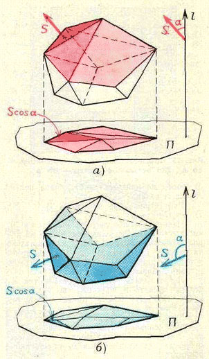 Нам понадобится такая лемма (ее доказательство мы даем в конце решения): если многоугольник имеет площадь S и его плоскость образует с некоторой плоскостью π угол α (0 < α < 90o), то площадь проекции этого многоугольника на плоскость π равна S cos α . Возьмем произвольную ось (направленную прямую) l и перпендикулярную ей плоскость π . Спроектируем все грани нашего многогранника на плоскость π, а соответствующие им векторы– на ось l . Если площадь одной из граней равна S , а угол, образуемый ее "внешней нормалью" с осью l , равен α , то проекция вектора на ось l равна (с учетом знака) S cos α , а площадь проекции грани на плоскость π равна |S cos α| . Мы пишем знак модуля, потому что угол α может быть не только острым (рис. a; грани, для которых cos α ≥ 0, мы называем верхними), но и тупым (рис.б; грани, для которых cos α <0, мы называем нижними). Рассмотрим теперь многоугольник, в который проектируется наш многогранник (на плоскость π). Этот многоугольник, как видно из рис. а и б, можно составить из проекций всех верхних граней, а можно – из проекций всех нижних граней. (Здесь мы пользуемся тем, что многогранник – выпуклый, поэтому на каждой прямой, параллельной l и пересекающей многогранник, найдется одна точка, принадлежащая верхним граням, и одна – нижним). Поэтому, если отделить среди чисел S cos α положительные и отрицательные, то сумма тех и других по модулю будет одинаковой. Следовательно, сумма всех чисел S cos α , соответствующих разным граням, равна 0. Итак, сумма проекций наших векторов на ось l , или, что то же самое (См. "Квант" #6, 1972г.), проекция их суммы на ось l равна 0. Но ось l выбрана произвольно, следовательно, сумма векторов равна0. |