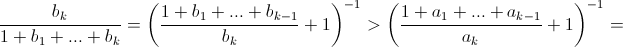 Пусть b1, b2, ..., bn – другой набор положительных чисел, сумма которых равна 1. Ясно, что bk > ak для некоторого k. Пусть k – наименьший индекс с таким свойством, то есть b1 ≤ a1, b2 ≤ a2, ..., bk–1 ≤ ak–1, bk > ak, тогда