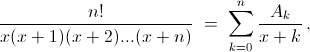 где Ak – некоторые числа. Умножим обе части на x(x + 1)...(x + n) и подставим x = –k. Тогда справа все слагаемые, кроме одного Ak(–k)(–k + 1)...·(–1)·1·2·...(n – k) = Ak·(–1)k·k!(n – k)!, обратятся в нуль, и мы получаем