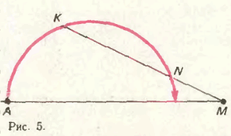 Приведем следующий пример. Рассмотрим множество, состоящее из точек полуокружности без одного конца диаметра (рис.2). Легко видеть, что такое множество удовлетворяет условиям задачи. Докажем что к нему нельзя добавить уже ни одной точки (это почти очевидно). В самом деле, если точка лежит внутри полуокружности на ее диаметре (рис.3, точка X ), то всегда можно найти такую точку C на полуокружности, что треугольник ACX будет остроугольным. То же самое имеет место для всех точек, лежащих вне полуокружности или внутри, но вне ее диаметра (рис.4, точки X' и X'' ; соответствующие точки B' , C' и B'' , C'' выбираются "достаточно близкими"). Если же точка выбирается на диаметре вне полуокружности (рис.5, точка M ), то имеет место вырождение– на рис.5 точки M , N , K оказываются на одной прямой.